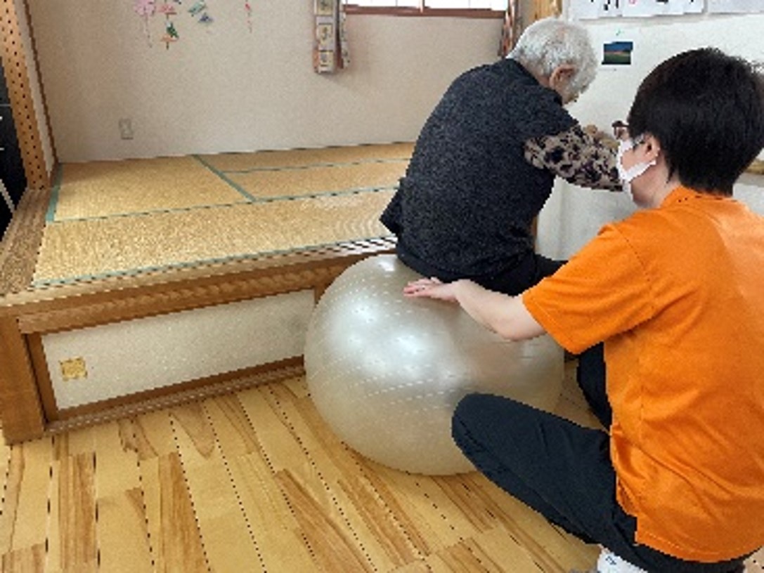 バランスボールを使った運動やホール内を歩行する等身体に負担がかからない運動で皆さん体力維持を図っています。